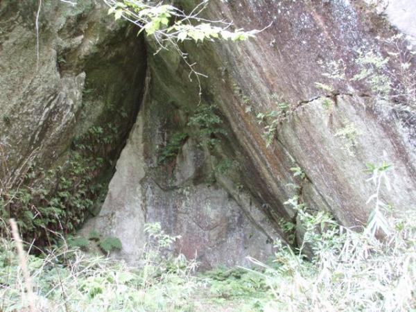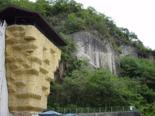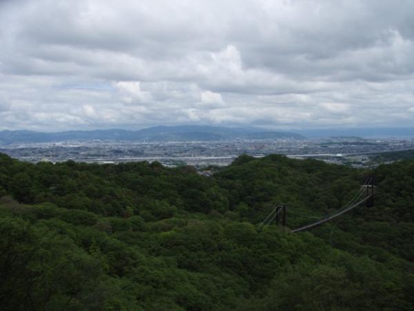 まずは「星のブランコ」交野吊橋へ。全長260mの吊り橋ですが、頑丈に出来ているので全く揺れませんでした。天孫降臨伝説のある哮が峰の山頂はすぐ近くのようでしたが、「通行止め」のロープがあったので行くのは断念。一旦下ってクライミングウォールと、ピトンの小屋のある広場へ。下から見上げると、哮が峰の岩壁が威圧感たっぷりでした。再び山道を登って展望台へ。ここからは吊り橋と京都方面が眺望できます。管理道を下って磐船神社へ行く途中、内部に三角形の空間がある岩場がありました。内側の前傾壁を登った人がいるのか、残置の支点が残されていました。