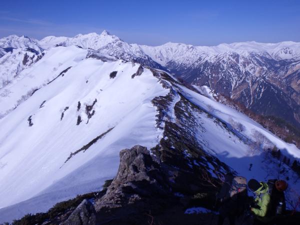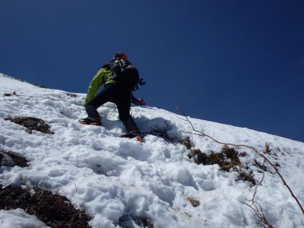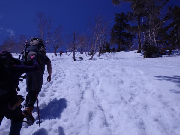 大天井岳への登りは急登が続く為、雪の状況次第では危険です。12本爪アイゼン・ピッケルは忘れずに。