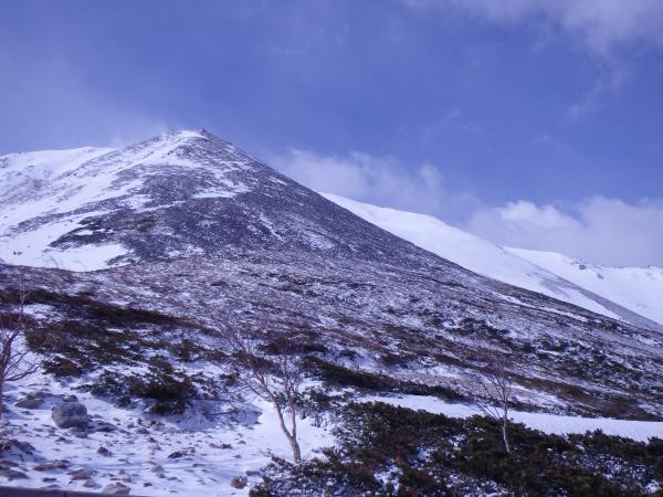 雪混じりの強風で稜線歩きはちょっと厳しい為、蝶ヶ岳までの縦走を断念。