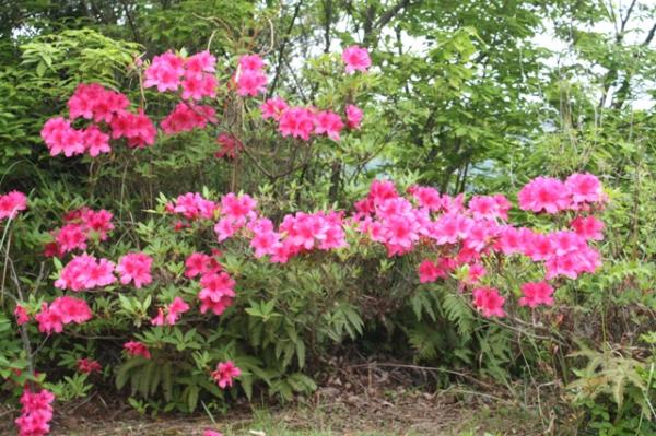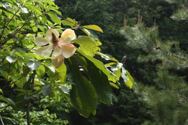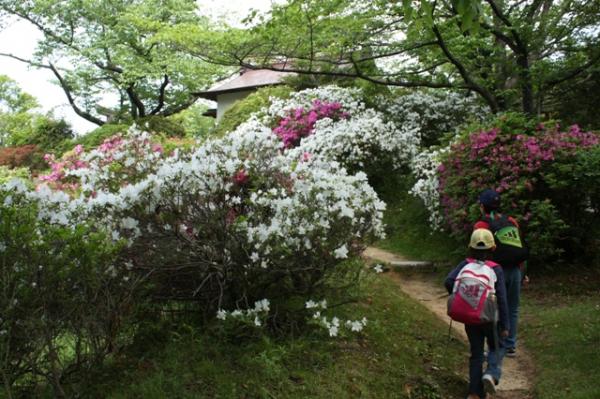 ツツジ、ホオノキの花が満開でした。フジの花も散っており、足元に紫色のの花びらがありました。