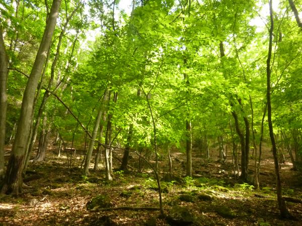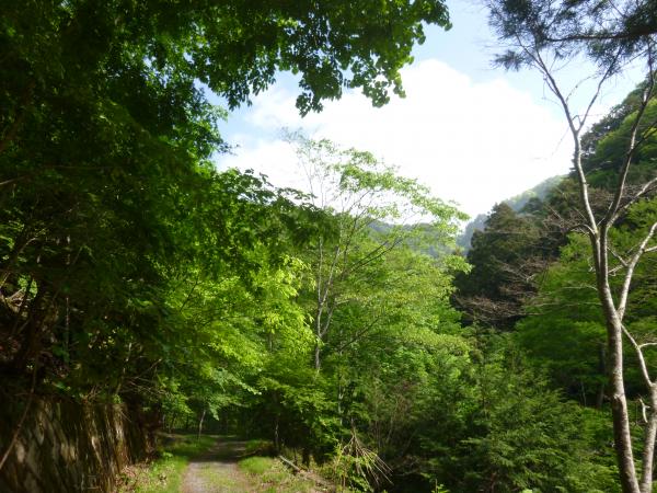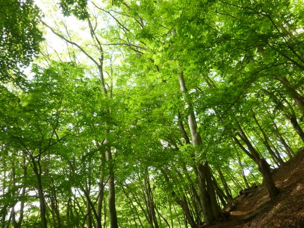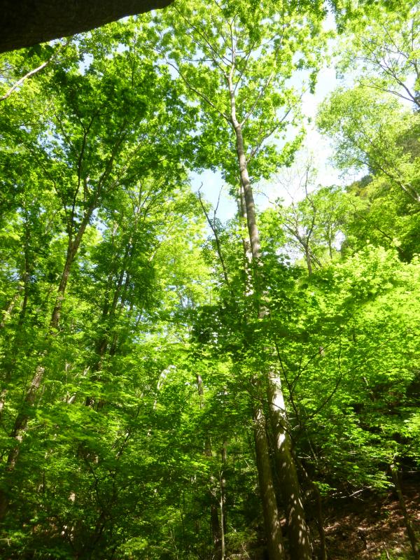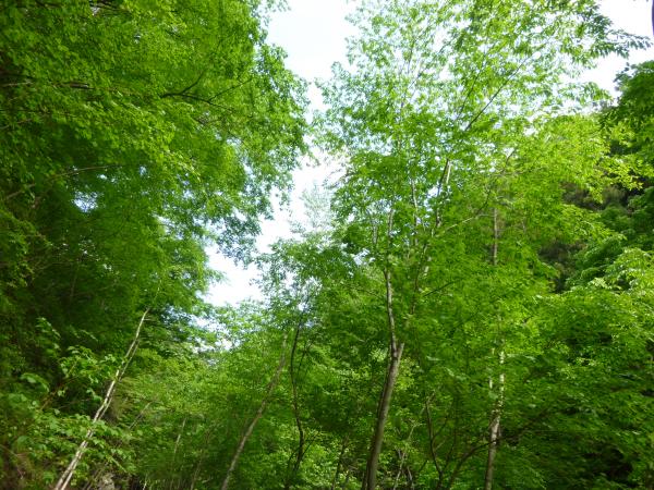 つづら折りの急坂が続きますが、新緑の中で深呼吸をすると疲れも少し軽くなる