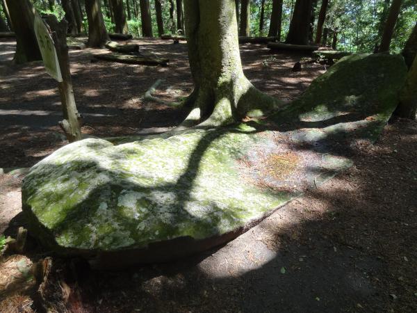 目覚めた義家がその太刀で巨石に切りつけると2つに割れて、1つが横倒しに