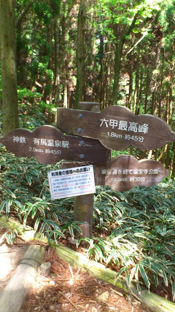 - 六甲ケーブル下→50分→前ヶ辻→30分→六甲山カンツリーハウス→40分→六甲山最高峰→20分→筆屋道分岐→10分→展望デッキ→10分→瑞宝寺公園→10分→有馬バスターミナル