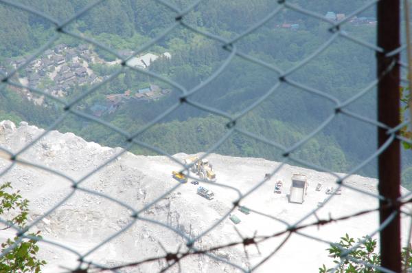 山頂は、直下で採掘が進んでいます。見下ろすと、作業車がオモチャのよう。真っ白な山肌が削られていました。