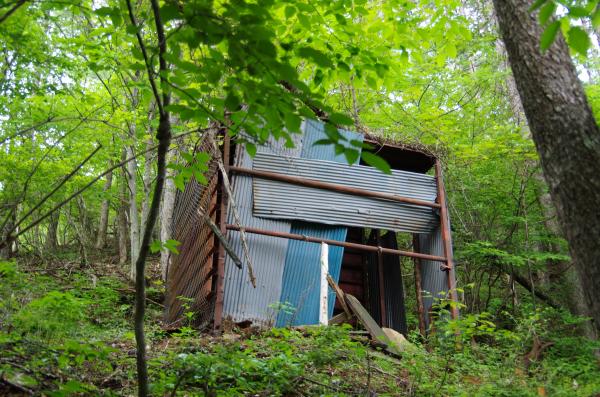 すぐ裏は石灰を掘る採掘場。途中、登山道の向こうには金網が張られ、避難所と表示のある小屋もありました。