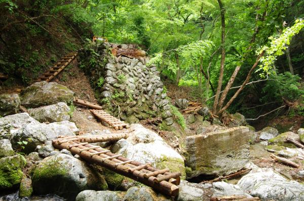 - 橋が落ちたということですが、丸太の橋が架かっていますので、増水していなければ心配ないと思います。水かさが増したら危険です。