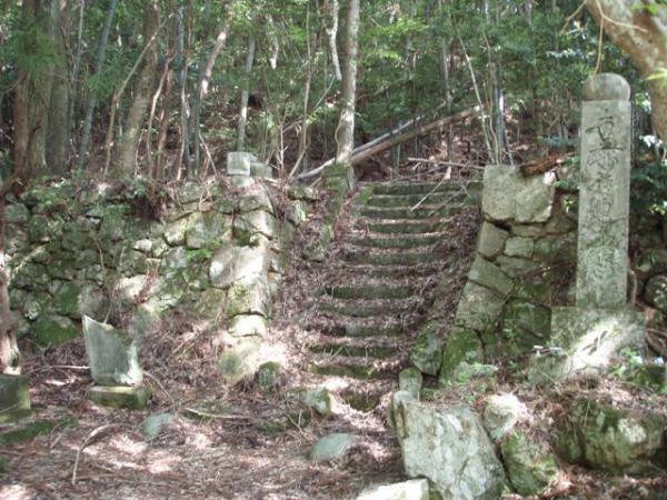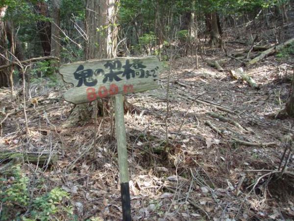 大乗寺の手前にある橋を渡ったところの登山口から入山。獣用の柵を過ぎ、つづら折れの山道をしばらく登って行くと、勾配がゆるやかになった所で追入からの登山道に合流。標識に書かれた「鬼の架橋」までの距離がどんどん近くなっていきます。足元に砕けた古瓦がちらほら見え始めると、園林寺跡に到着。階段部分はしっかり残っていますが、寺自体は完全に崩壊しており、木材と瓦が散乱するばかりの廃墟と化していました。