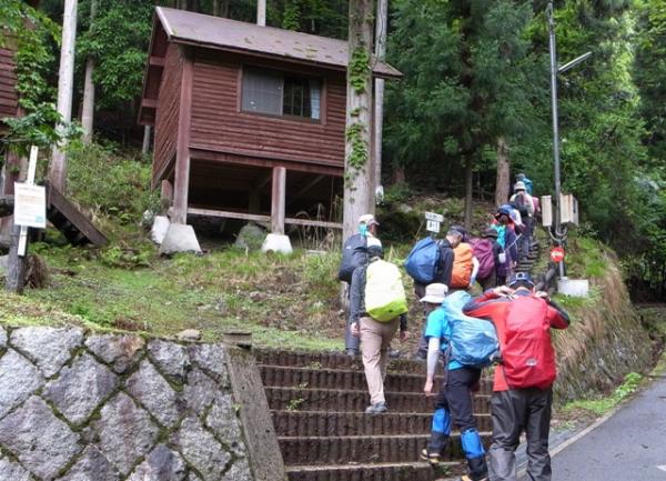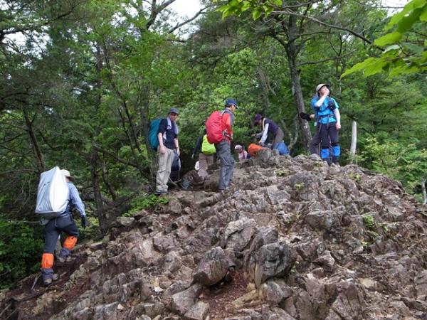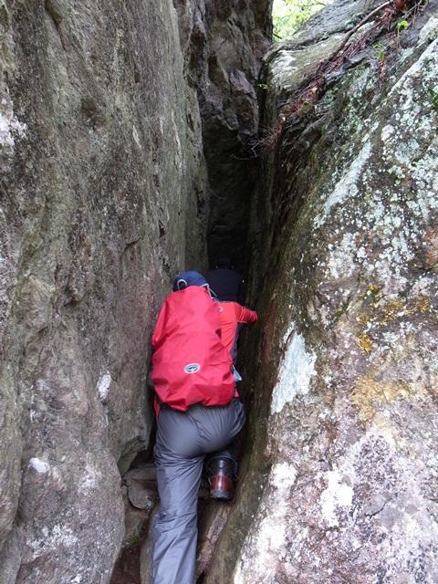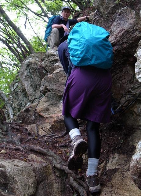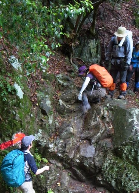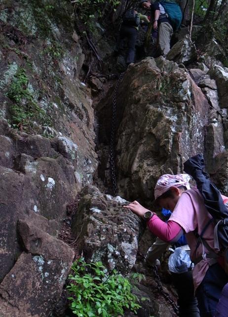- 前線による雨のため、岩部分はやや滑りやすかったです。鉾立山から下りだしは急な杉林です。虹ヶ滝付近はふるいロープや滑りやすい岩、どころどころ浮いた石もありました。