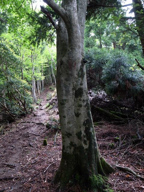 4等三角点(915m)から鉾立山にかけては幅広い登山道です。荒れた部分もありますが、ところどころ広葉樹が残っています。一本の太いブナがありましたので見つけてみてください。