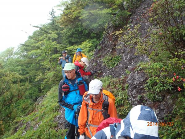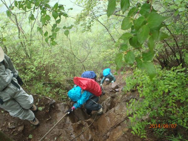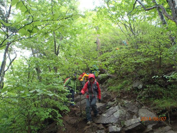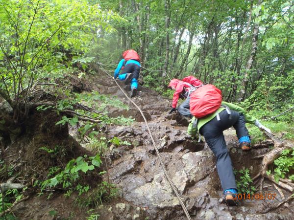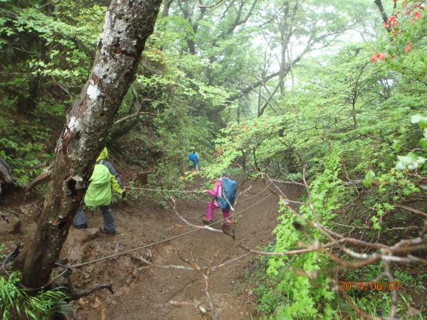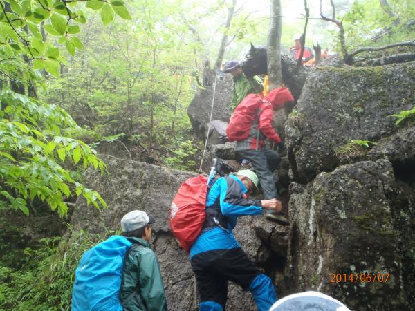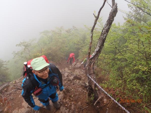 - 雨の影響で全体的に滑りやすく、難易度が上がっていました。 毛無山から十二ヶ岳まで急な岩場が連続します。