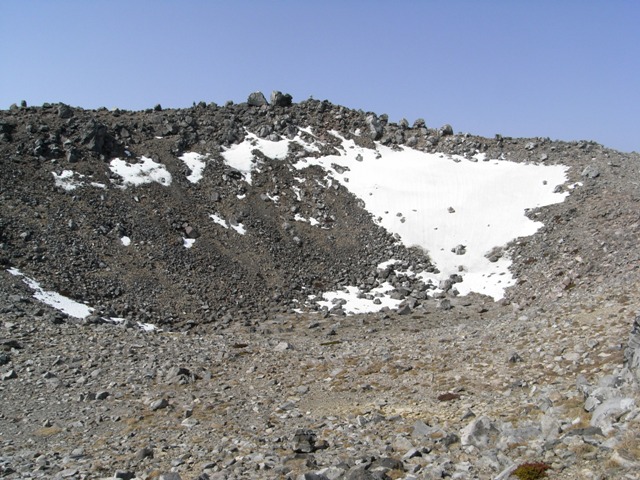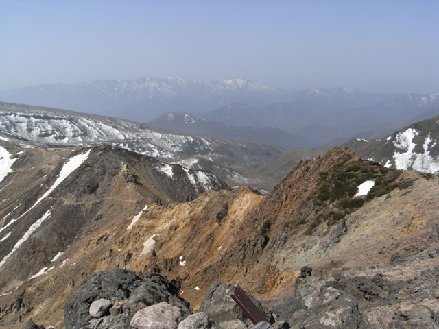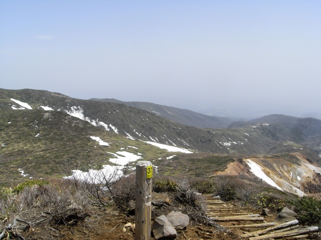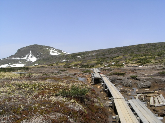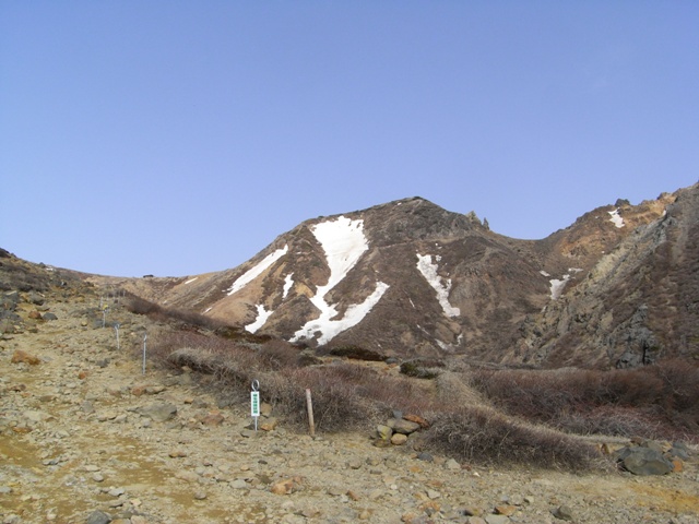 - まだまだこの時期は残雪が多く、峰の茶屋から朝日岳に向かう山道は雪渓のトラバースしなくては行けませんので、