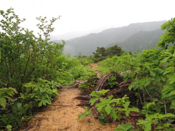 登山口から下台倉山までは細い尾根道を登って行きました。雨で岩が濡れているので気を付けながら進みます。鎖場も多々ありますが、慎重に登ればそれほど危険はありません。