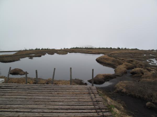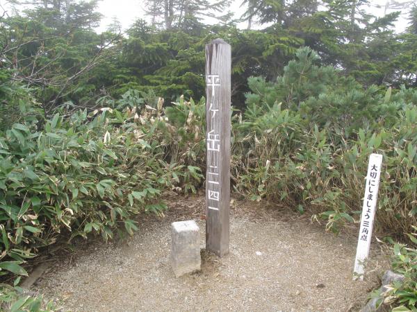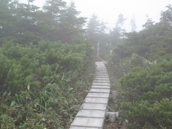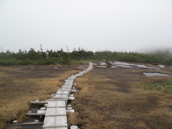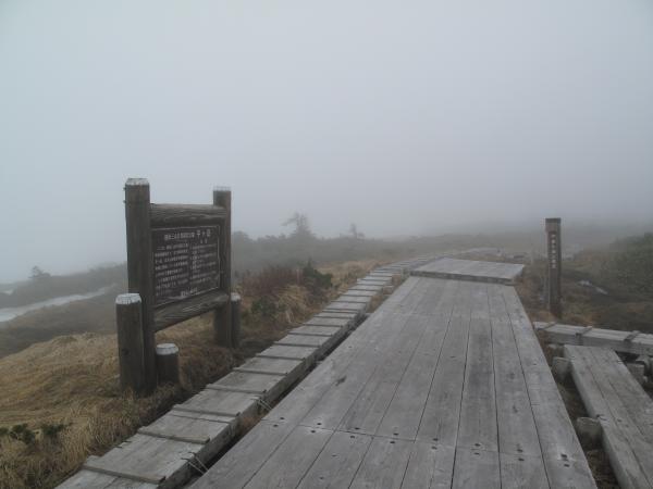 木道が出てきたらすぐに池ヶ岳です。名物たまご岩があるらしいのですが、時間がないので先を急ぎました。約30分で平ヶ岳に到着。しかし、山頂手前から霧が…。周りの景色はほぼ見えず。達成感しかありませんでした。