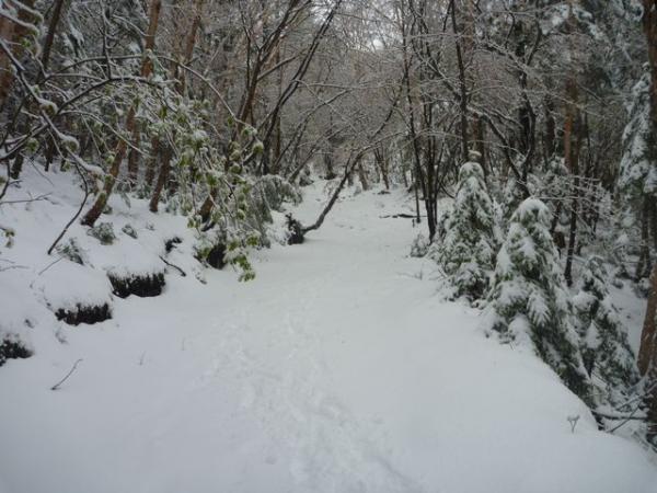 雪はびっしりとついているので、直登コースの下山道へ。