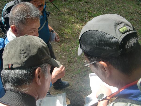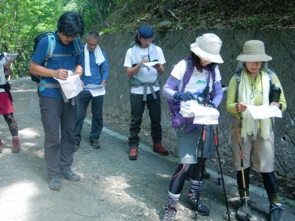 バスの車内で軽く机上講習の復習をし、登山開始前には実際に地図とコンパスを使用して