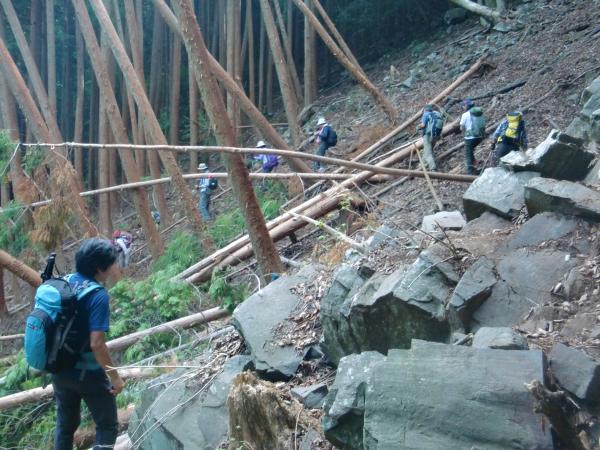 斜面が崩れ登山道が分断されている場所に遭遇しました。