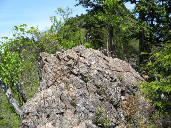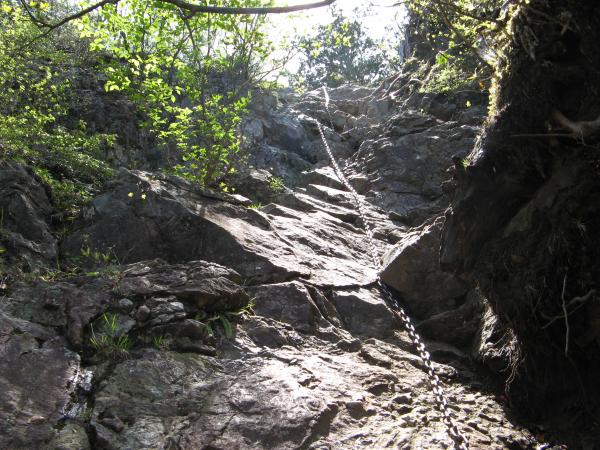 このコースは往復でかなりの鎖場を通過しますが、鎖が設置されている場所でもしっかりした手がかりや足を置ける場所があるところも多いので、そういう場所では鎖に頼らないほうがかえって安全に登降できます。あまり鎖にしがみついてしまうとバランスを崩したときに振られたり、腕の疲労が溜まってしまい帰りの鎖場が辛くなるので頼りすぎに注意です。
