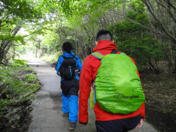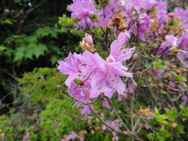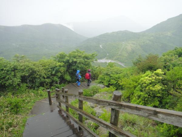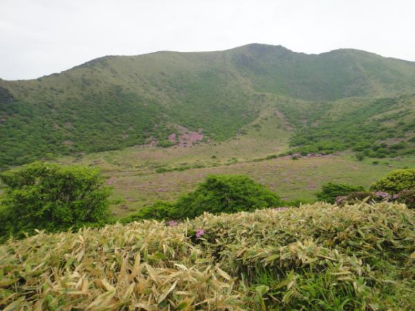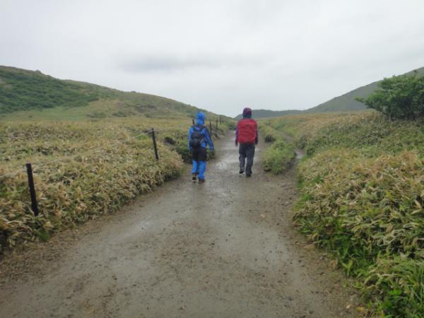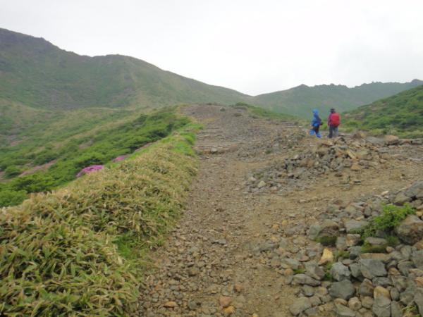 全体的になだらかな道が続く。ところどころでツツジが咲いており、雨の中とは言え写真休憩も自然と挟まる。山並みが見渡せるようになると、斜面がピンクになっていた。少し離れた平治岳(ひいじだけ。難読である)では咲き乱れているらしい。写真を見せてもらったが、目に痛いくらいだ。見てみたいが、今回はそこまででではない。