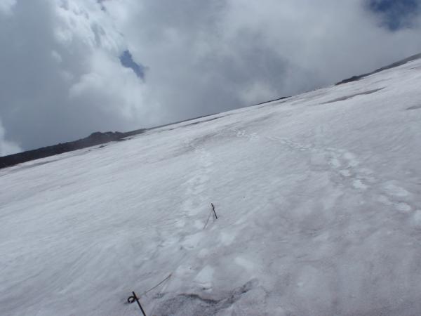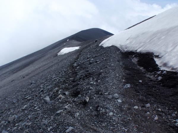 - 登山道はまだ整備中です。七合目手前あたりから残雪が出てきます。それより上部はまだアイゼンなどが必要でしょう。