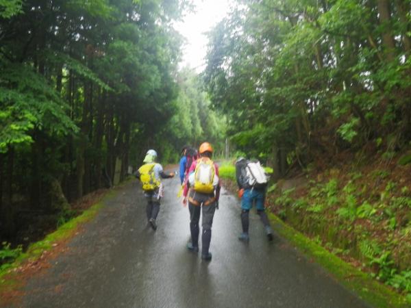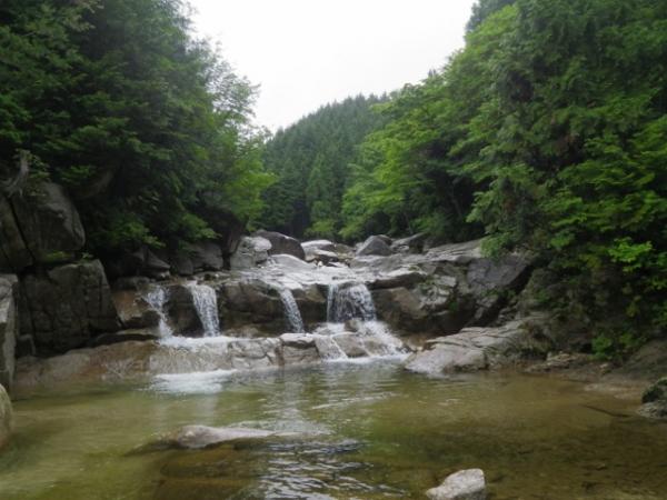 - 駐車場(50分)~入渓点(150分)~赤坂谷・ツメカリ谷を結ぶ枝沢(50分)~ツメカリ谷出合(70分)~神崎川出合(60分)~堰堤(50分)~駐車場