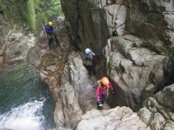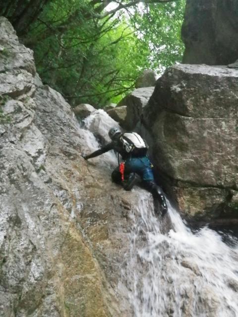 赤坂谷は豊富な水量の中を泳いで、へつって、シャワークライムを楽めるおススメの沢です。斜滝トイ状8m滝の後の10m滝のへつりは高度感もあり少し緊張しますが、岩は固く、ホールド・スタンスもしっかりしていてます。
