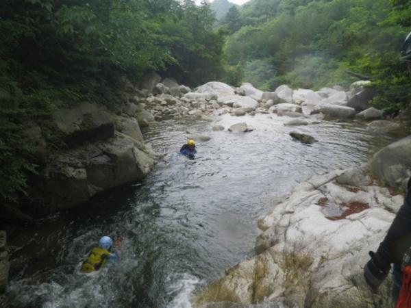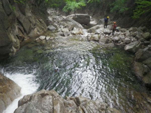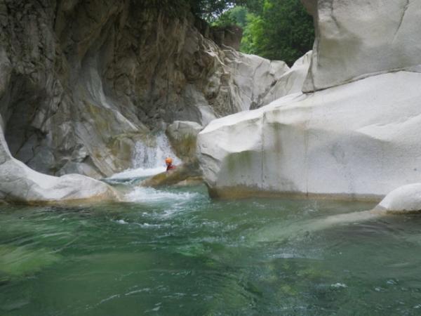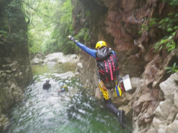 ツメカリ谷、神埼川の下りは滝の上から釜に飛び込んだり、プカプカ浮いたりと、子供の頃に戻ったような気分で水遊びを楽しみました。