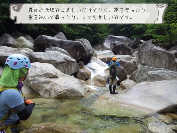 最初は赤坂谷を遡上していきます。赤坂谷前半はとても面白い滝が続きます。基本、すべての滝を巻かずに突破できます。仙古谷出合を過ぎると様相は一変し、明るく開けた沢になります。美しいナメ滝が増え、軽快に進むことが出来ます。