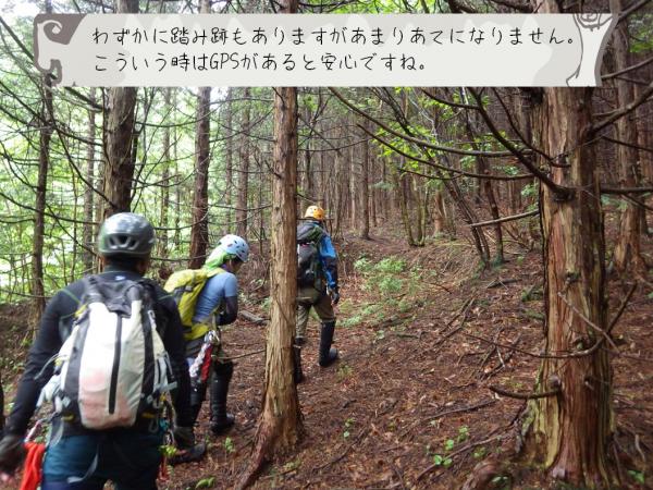 赤坂谷からツメカリ谷まで尾根を乗越ますが非常にわかりにくいので、このルートの経験者がいない場合は、地図とコンパスと読図技術が必須です。道迷いに注意。