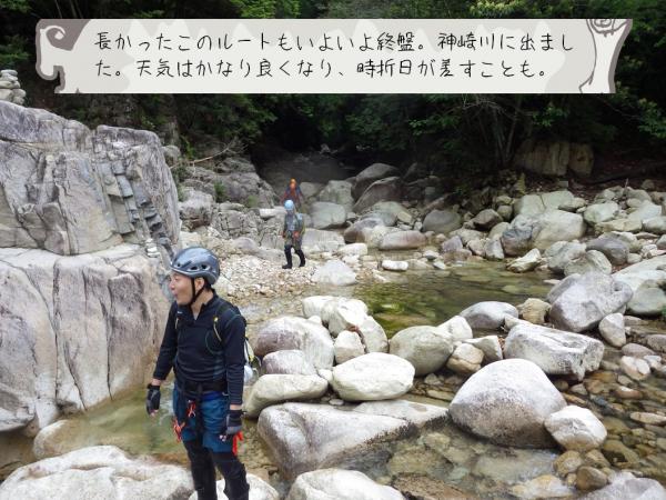 - 駐車場(50分)入渓点(150分)枝沢(55分)ツメカリ谷出合(75分)神崎川出合(60分)遡行終了点(60分)駐車場