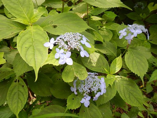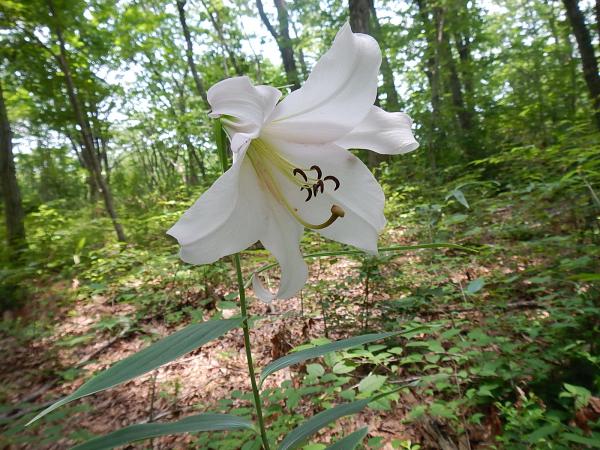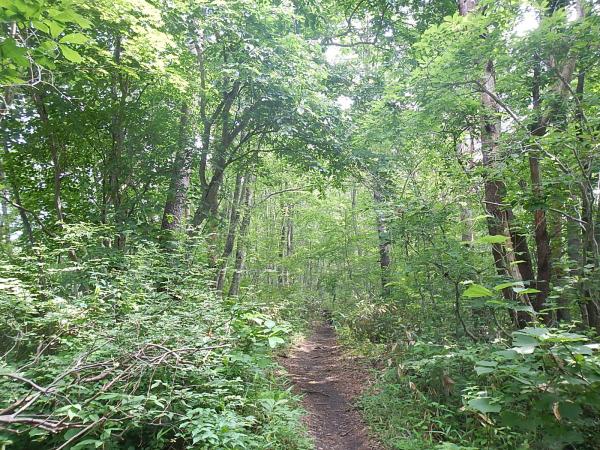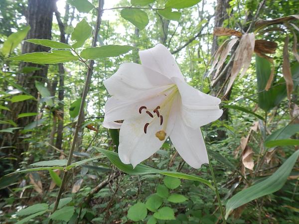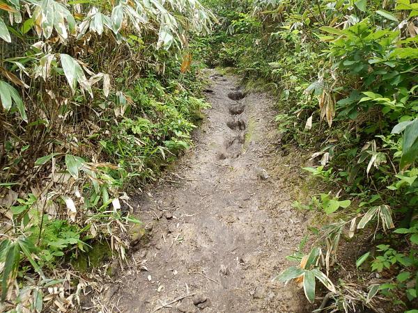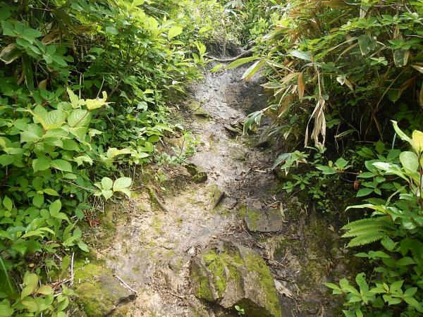 一合目までは高原を散策するかのようになだらかな道が続きウォーミングアップには最適、ササユリにも出会えて感激!二号目付近は谷筋を歩き、三合目からいよいよ傾斜が急になってきます。始めは柔らかな落ち葉の上を歩き足にも優しい道だと思っていたら粘土質のため勾配が急になってくると滑る・滑る。