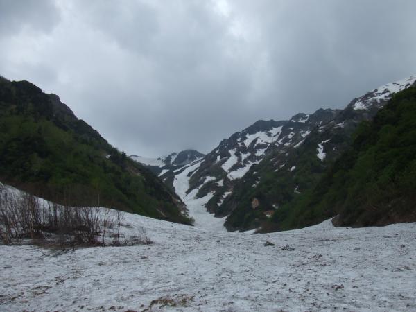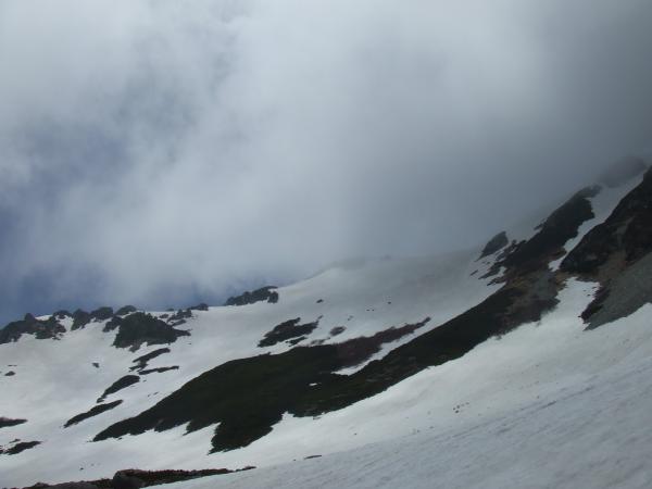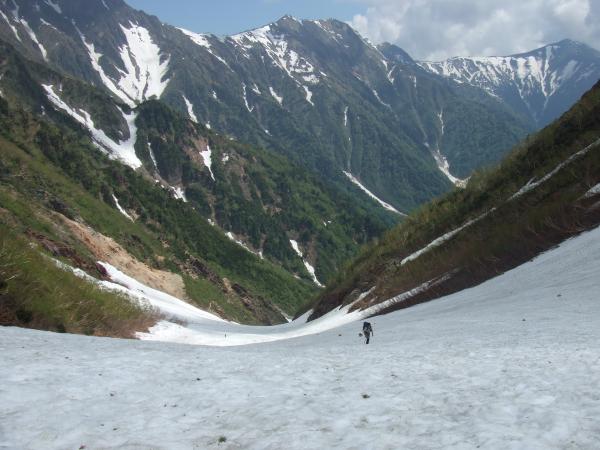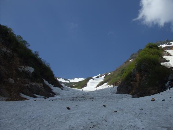 扇沢から雪のない登山道を約1時間登り、雪渓を登っていきます。
