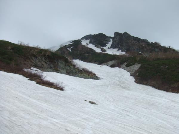 稜線からは雪はなく岩が出ていたので、アイゼンをはずして頂上へ。