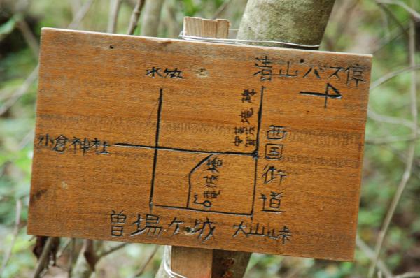 - 七ツ池登山口→(60分)→曽場ヶ城山山頂→(20分)→水ヶ丸分岐→(15分)→大山の滝→(20分)→旧山陽道合流→(20分)→大山峠→(35分)→七ツ池登山口