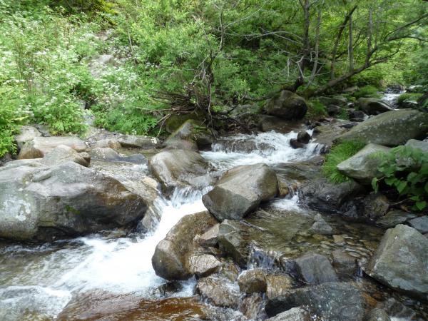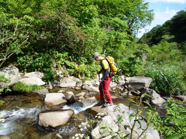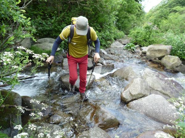 登山道の最初に渡渉します。水量が多いと厳しいと思います。水量が多くなければ、足置きの岩は安定しています。