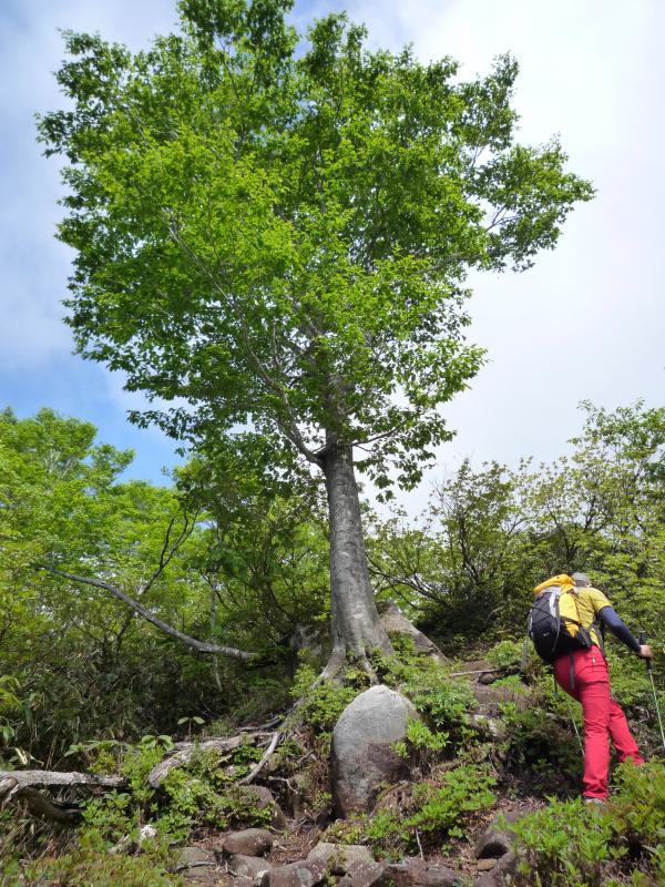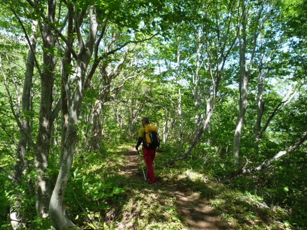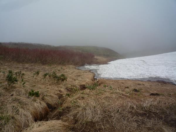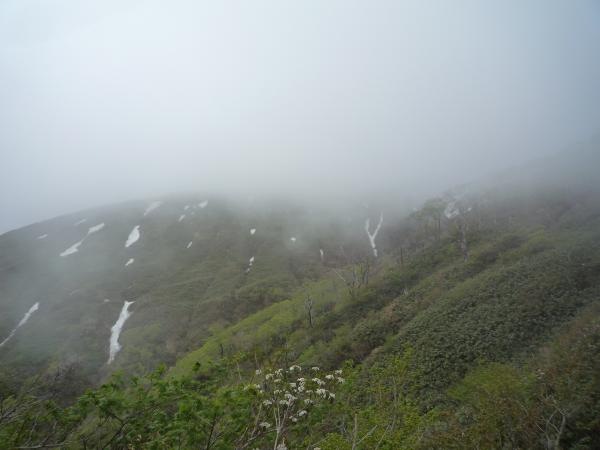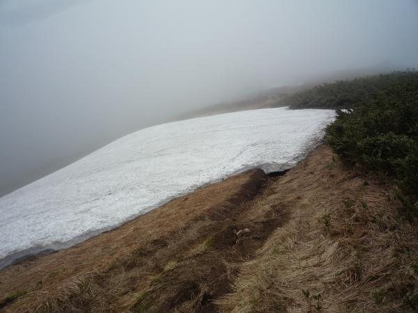 頂上付近では雪渓が残っているため、歩行に注意が必要です。軽アイゼンがあると安心です。