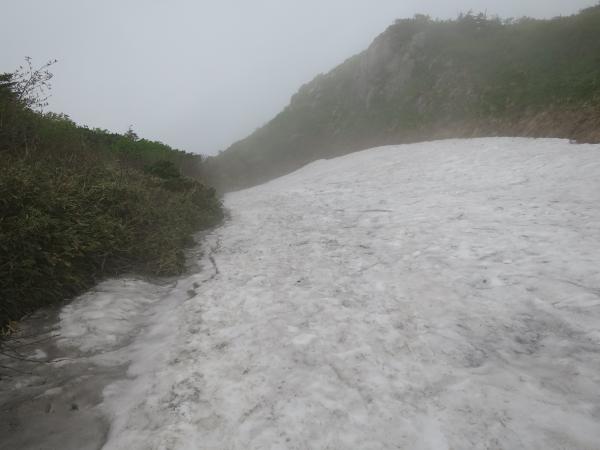 - 下山に利用した観光新道は雪渓が5カ所ほどあったがトレースはしっかりしているので道迷いなし。