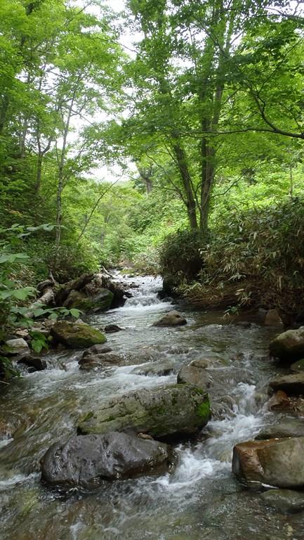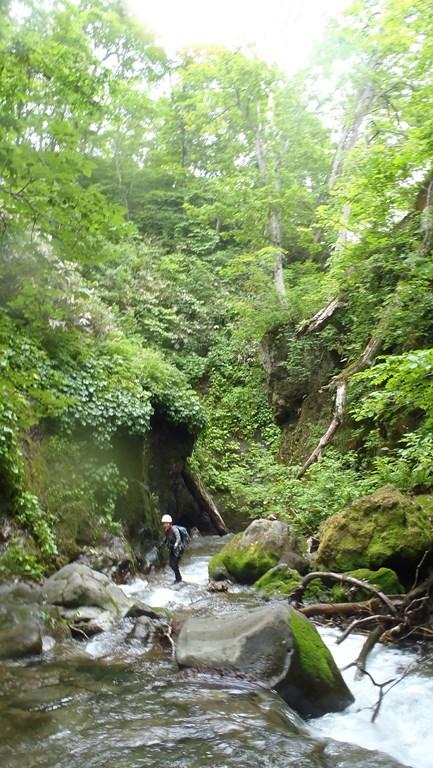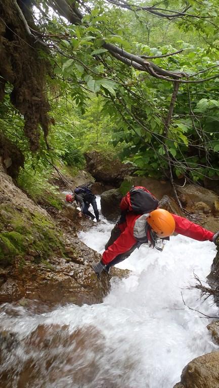ニセコ周辺は目立った沢はないのですがこのニセコアンベツ川は短いながらも面白いと教えていただき、同じ山岳会の方々と遡行してきました。確かに短い中に函の突破や滝の登攀、へつりなどわずかな流程にギュッと中身の詰まった沢でした。積極的に水流突破を狙うといいトレーニングとなると思います。沢初めにはちょうど良かったかもしれません。登り始めは昆布温泉、下山地点も五色温泉というのもなかなかいいものでした。