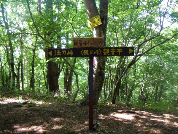 - 観音峰登山口[15分)観音水(8分)第一展望台(18分)観音平(21分)観音峰展望台(35分)観音峰(60分)法力峠(60分)稲村小屋(30分)大日山(30分)稲村ヶ岳(33分)稲村小屋(60分)法力峠(50分)稲村ヶ岳登山口(20分)洞川温泉バス停