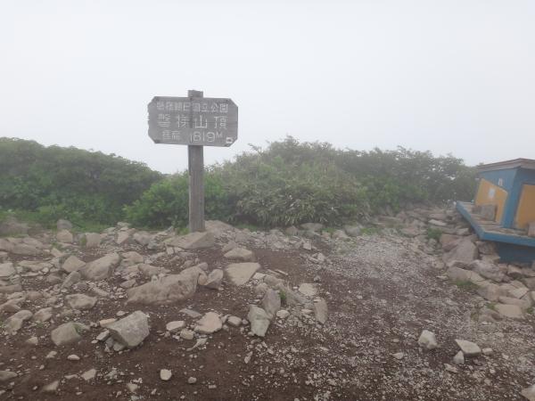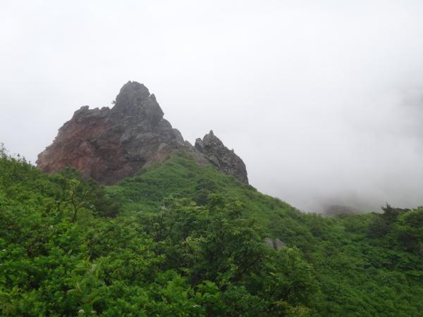 裏磐梯の絶景ポイントといえば銅沼(あかぬま)。銅色の湖沼と、そこから聳える爆裂火口に、まるで他の惑星にいるような不思議な感覚を覚えました。地球の鼓動を感じながら歩いていると、雨が急に強く降り出し、折角の気分に文字通り水を差されてしまいました。そこからは降っては止みの繰り返し。お花畑に出ても辺りは白の世界、見上げる山頂も残念ながらガスの中。急な岩場を登って辿り着いた頂上もやはり真っ白で、会津の街並みや猪苗代湖が見えなくて少し残念でした。