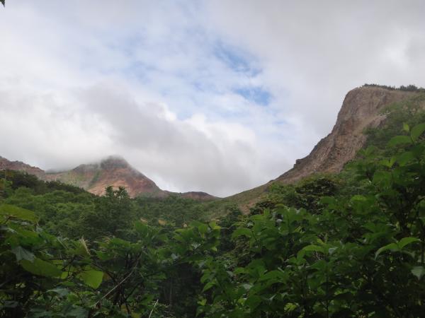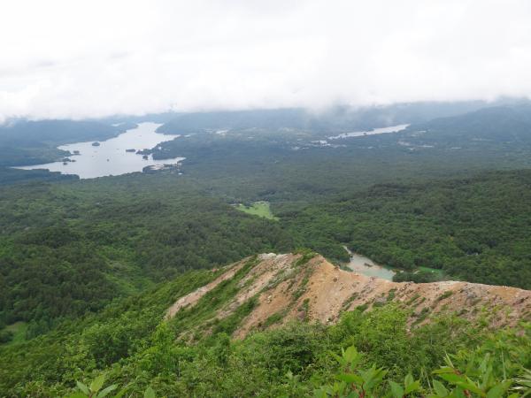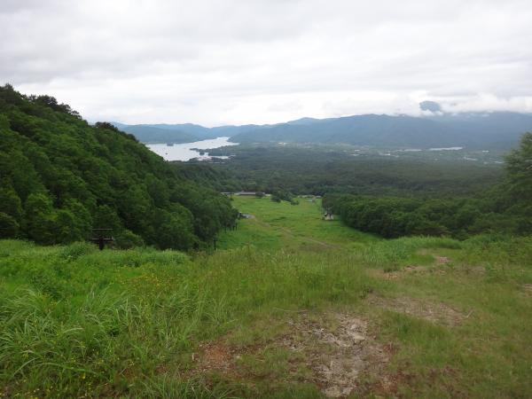 五色沼を後にして、車道脇の裏磐梯登山口から漸く磐梯山を目指します。裏磐梯スキー場まで砂利道を暫く歩き、リフトが見える頃には磐梯山の赤茶けた山肌が次第に大きくなってきました。スキー場はコウリンタンポポやアザミが咲き乱れ、眼下には広大な桧原湖、思わずお弁当を広げたくなるような長閑な景色が広がっていました。のんびりしたいところでしたが、道はまだまだ続くので先を急ぎます。裏磐梯はあまり人気のないコースのようで人と遭遇しない代わりに、可愛らしいヒメネズミや蛇、クワガタムシまで、多彩な動物たちと出会いました。
