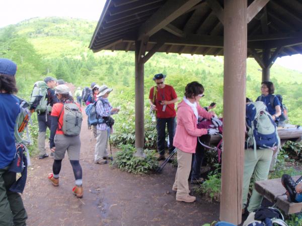 つつじ平から鐘の分岐までは比較的フラットで途中に東屋あり そこからの南峰までは岩と笹の登り。