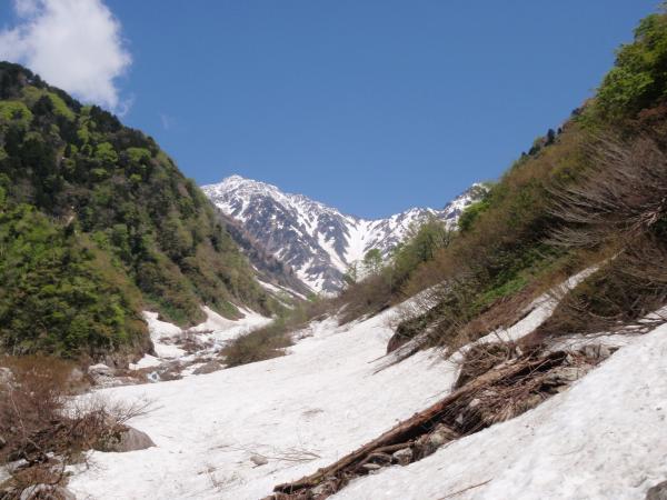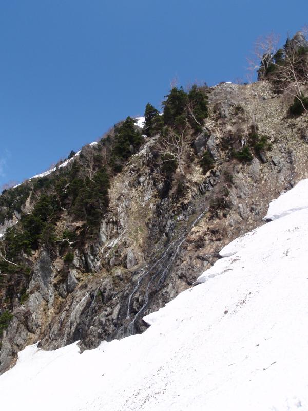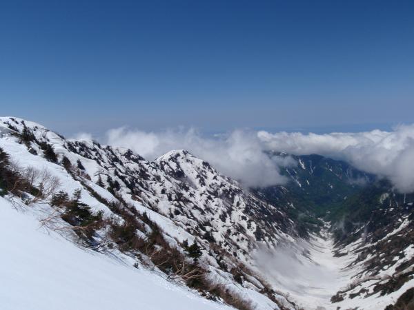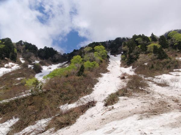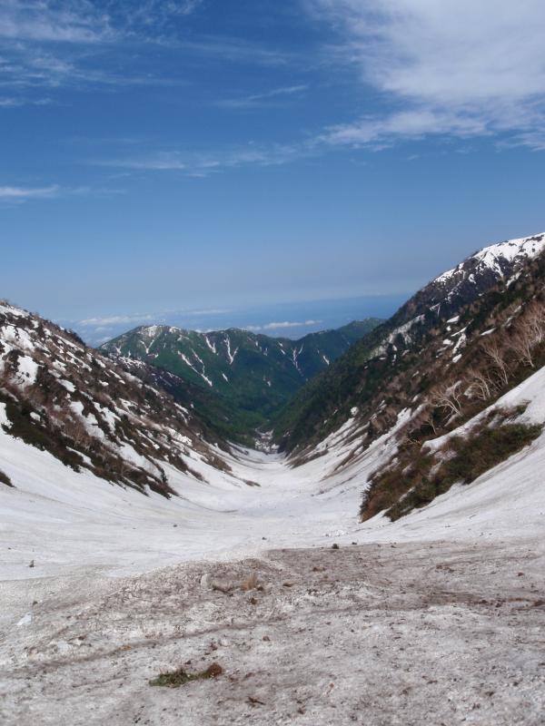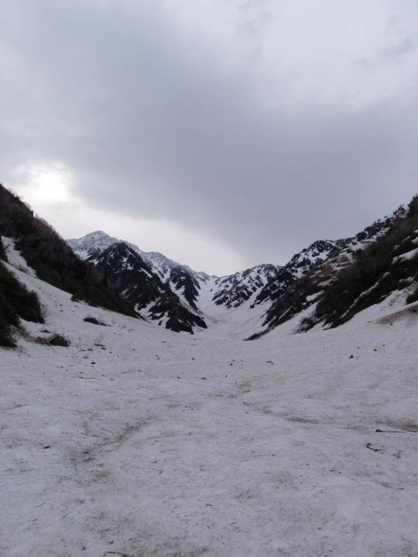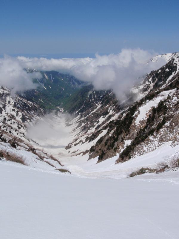 1800m付近で雪崩が発生していたようで、谷のほとんどをデブリが覆っていたために途中でスキーをデポした。その先は、アイゼンで登る。途中、後ろから来た二人組みのパーティーに追い抜かれてしまう。