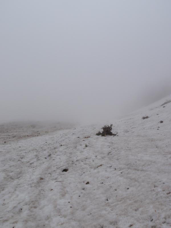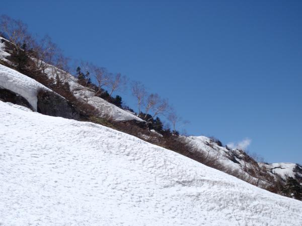 稜線付近は、新雪で覆われていた。追い抜いていったパーティーに感謝する(助かった~)。