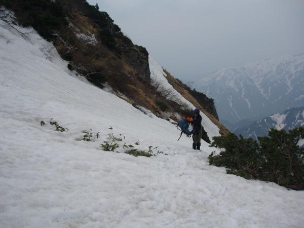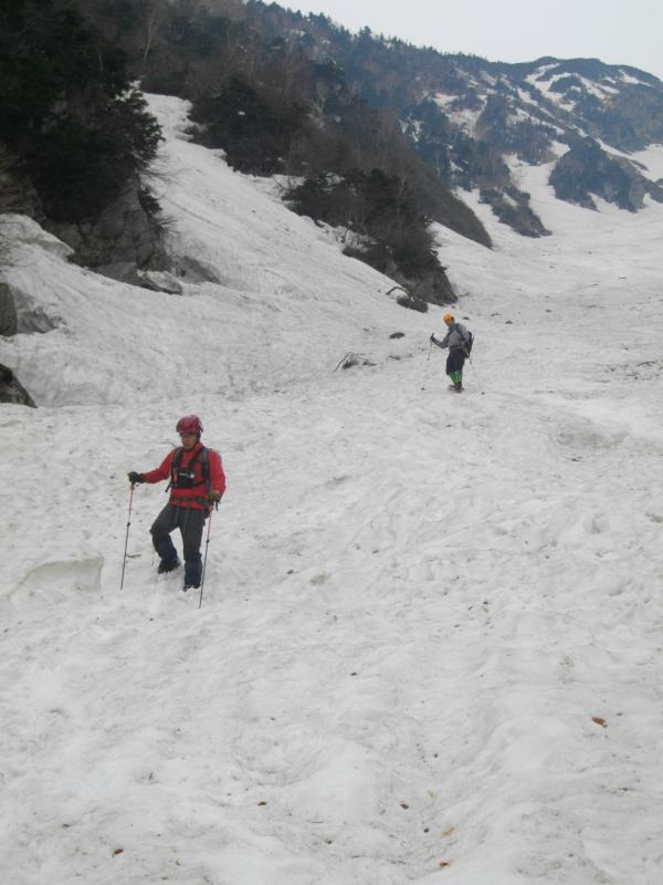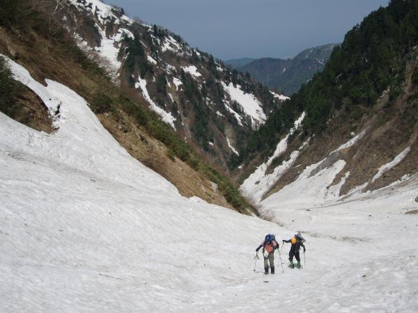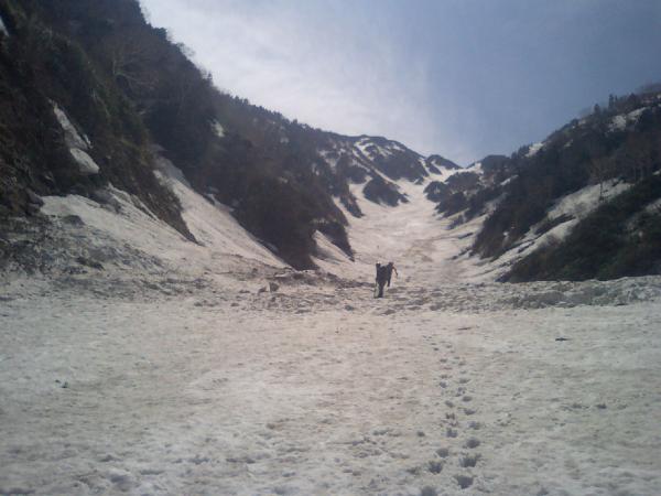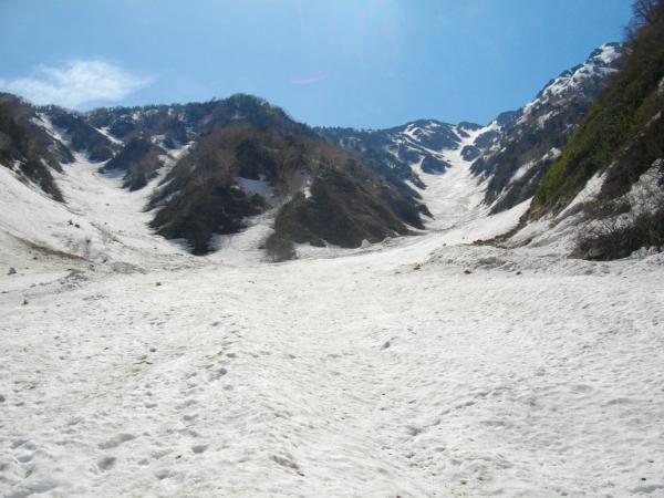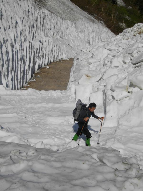 - この時期車が入れるのは片貝第4発電所まで。阿部木谷最終堰堤間での林道歩きが長くて疲れす・・・。林道には大きな石が転がっていたり。落石注意。阿部木谷、毛勝谷、ボーサマ谷と豊富な雪渓上を歩きます。常に落石、落雪に注意が必要。特に板菱と呼ばれる最終堰堤を越えた狭い谷は要注意。前半は緩やかな傾斜。三ノ又から上部は斜度が増してくるのでアイゼンを装着。コル直下はもの凄い急斜面。登りも大変ですが下りが怖い。慎重に。