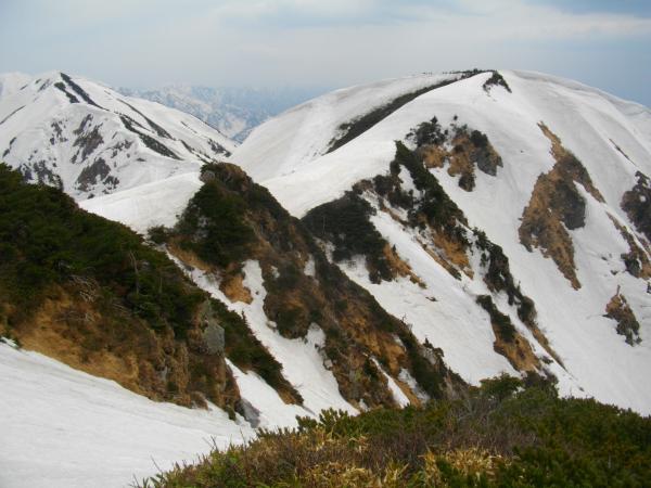 残雪期に雪渓を歩くのは久しぶりで、ただただナガイ登りに疲れ果てました。特に今回は林道歩きの時間が長くて参りました。前日、緊張からか寝むれなくて睡眠0時間で挑みました。総行動時間約14時間。下りでは足の小指が痛くなって大変!林道でヘッドランプ点灯。車に戻る頃にはすっかり日が暮れてしまい真っ暗でした。お昼休憩を長めにとってしまったからか。(苦笑)山頂からは釜谷山、猫又山、劔岳、後立山の山々、駒ヶ岳、僧ヶ岳と目の前に広がり景色は申し分なしです。しっかり睡眠をとって食物も沢山持って行きましょう。正直、私は歩きながら時折止まって立ったまま寝てましたから。体調管理は万全に。無茶な山行は避けてください。装備ですがピッケル、アイゼンは必携です。かなり日焼けしますから日焼け止めをお忘れなく。サングラスもあると良いです。
