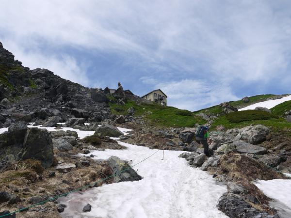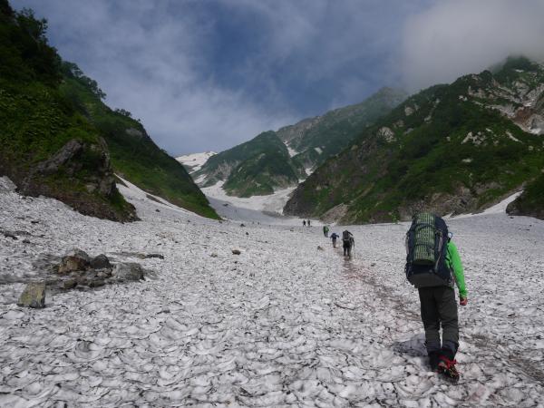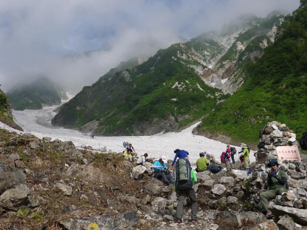 - 大雪渓:白馬尻からびっしりと雪があります。アイゼンは4本爪では歩きにくそうで、6本爪以上がおすすめです。また落石が多く、雪上に無数の石があります。