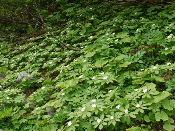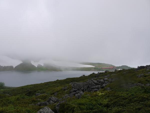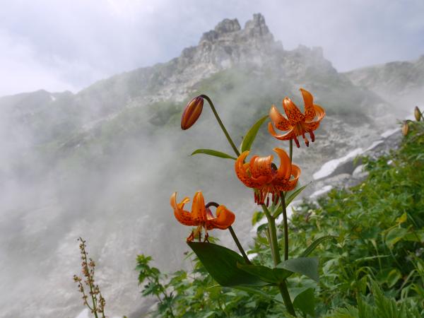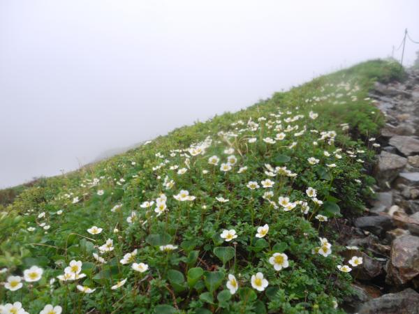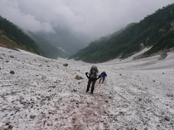 みごとな大雪渓で有名なコースから白馬岳頂上を経て小蓮華岳、白馬大池と巡る大パノラマコース!ですが今回晴れ間があったのは初日の登りのみでした。それでも雪渓上から見える稜線付近の景色はとても美しかったです。大雪渓、小雪渓を過ぎるころにガスで視界がわるくなり、テント場に着くころには周りはガスで真っ白。テント設営して周囲を散策しても見えるのは目の前の花ぐらいでした(花が見れたのですから贅沢を言ってはいけませんね)。