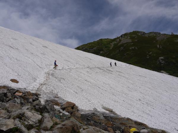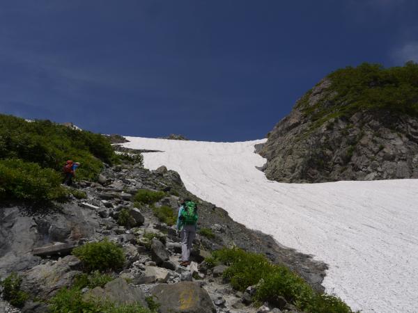 小雪渓:山小屋の方々がショベルとチェーンソーで雪上にトラバース道をつくってくれていました。トラバースはほぼ水平ですが、足下の斜度は急ですので面倒がらずにアイゼンを装着するべきです。