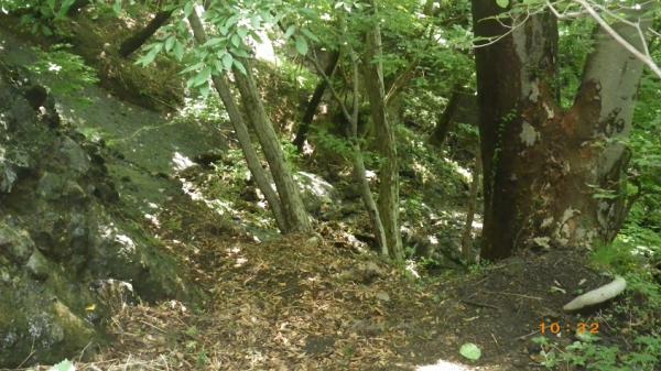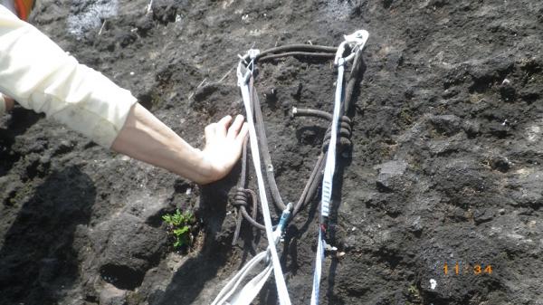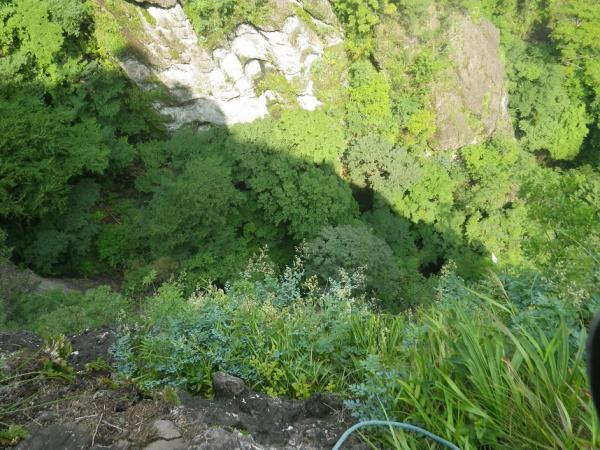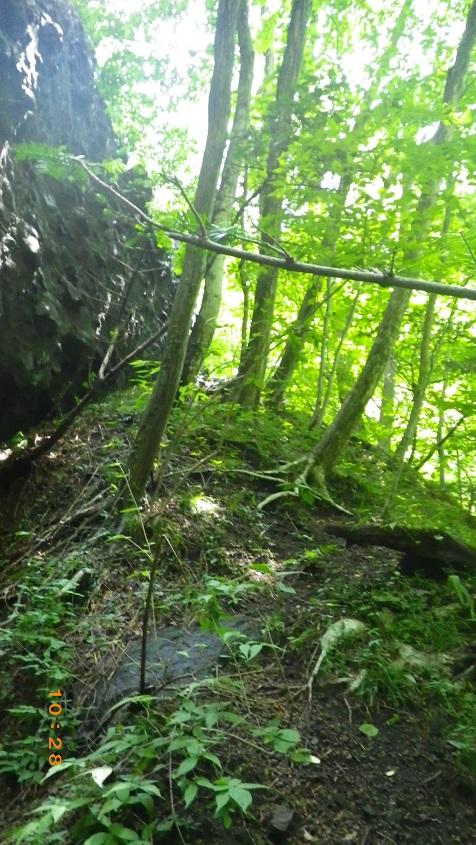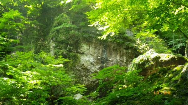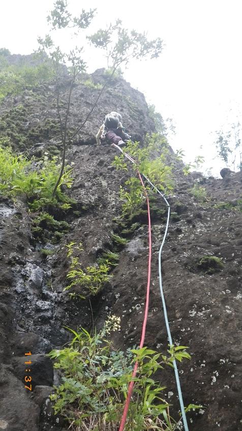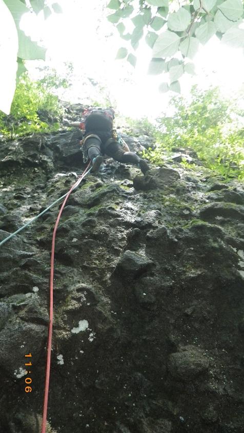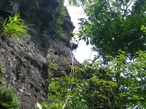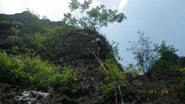 - 雨上がりでヒル多数 取りつきまでは割合わかりやすい。沢沿いに登山道を丁頭の頭にむけて歩き、左に白い壁がでてきてひらけたかんじのするところで12時の方角に洞穴があります。洞穴から右に10メートル弱で取りつき。