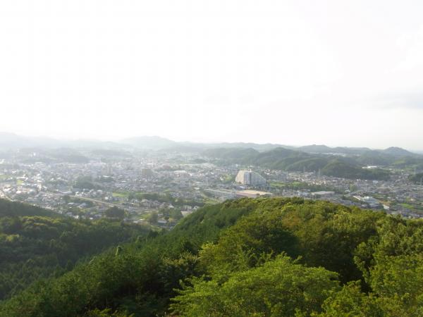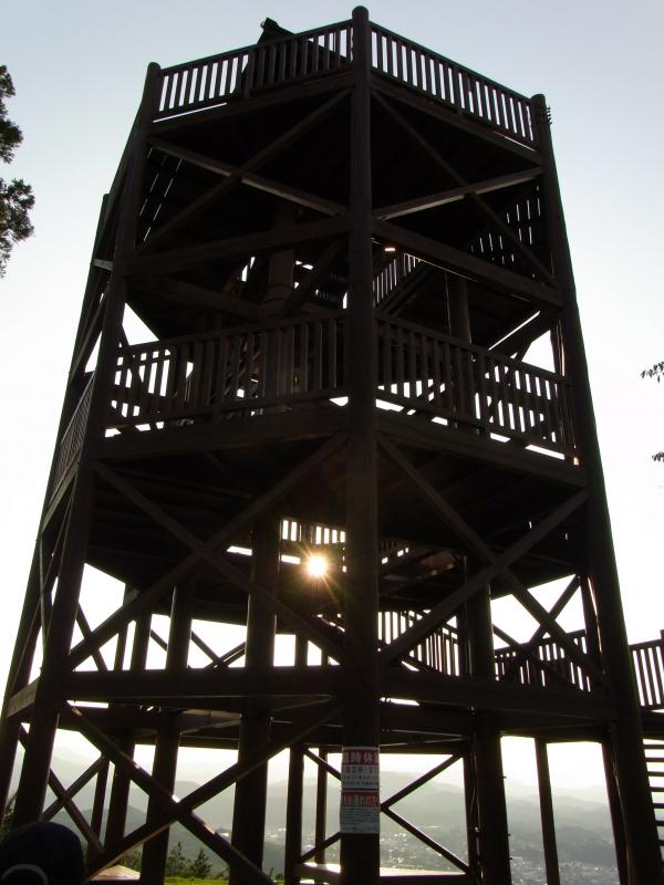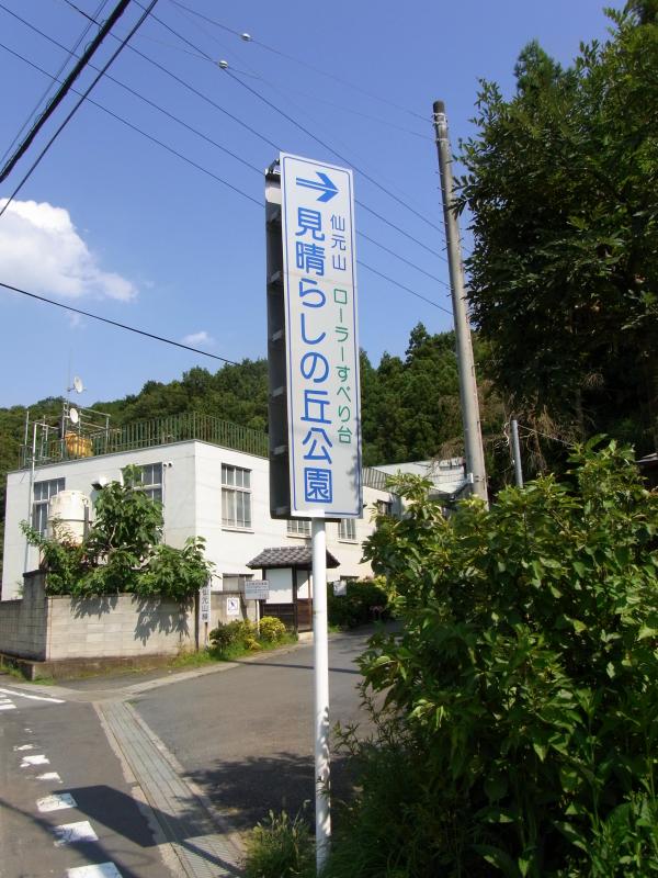 駅からふつうの車道を歩き、目の前にぽっかり見えてくる小山が仙元山。中腹に櫓のようなものが見えますが、ここが見晴らしの丘です。